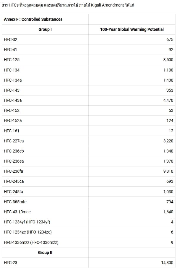 อย่างไรก็ตาม สารทำความเย็น HFCs เหล่านี้ ก็ยังถือว่ามีค่าศักยภาพในการทำให้เกิดภาวะโลกร้อน (ค่า GWP) และค่าศักยภาพในการทำลายชั้นบรรยากาศโอโซน (ค่า ODP) ที่สูงอยู่ดี ดังนั้น ในการประชุมของประเทศภาคีสมาชิกพิธีสารมอนทรีออล ครั้งล่าสุด ซึ่งมีขึ้นเมื่อวันที่ 28 ตุลาคม 2016 ณ กรุงคิกาลี (Kigali) และได้มีข้อตกลงร่วมกัน (ที่เรียกว่า Kigali Amendment) ในการลดปริมาณการใช้ และการผลิต สารทำความเย็นประเภท HFCs ลงอีก 85% เพื่อให้เหลือเพียง 15% ของปริมาณการใช้งานในปัจจุบัน ซึ่งมีแผนในการลดการใช้สาร ดังนี้