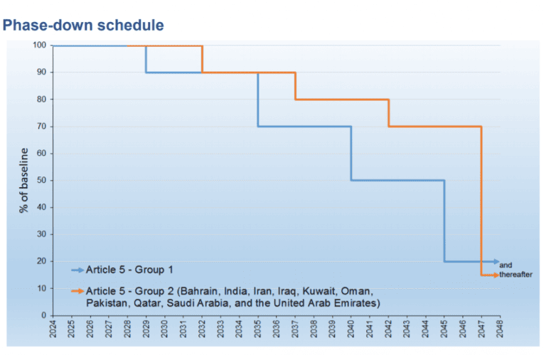 กลุ่มที่ 2 ประเทศ Bahrain, India, Iran, Iraq, Kuwait, Oman, Pakistan, Qatar, Saudi Arabia, UAE เริ่มควบคุมปริมาณในปี 2028 และเป้าหมายลดลงเหลือ 15% ในปี 2047